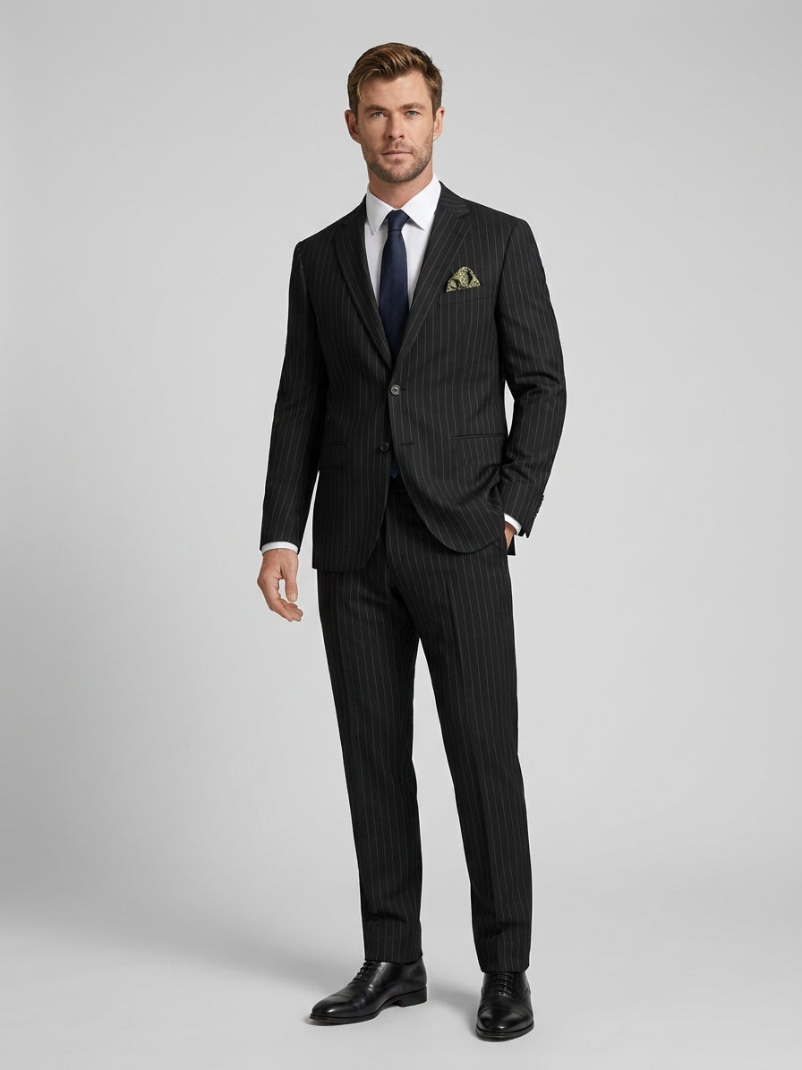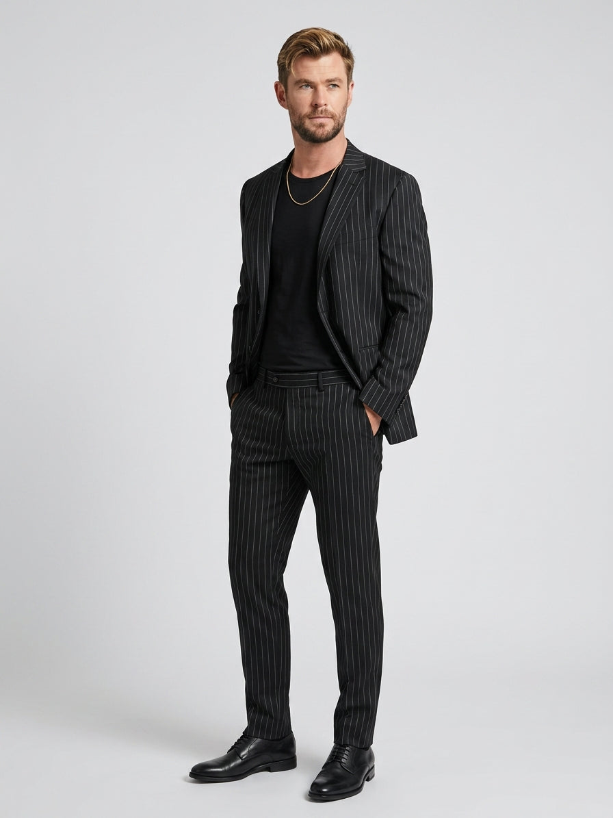 Abito nero gessato dal gusto classico e ricercato, pensato per chi desidera un look elegante e autorevole. Il motivo a sottili righe verticali slancia la figura, mentre la giacca con rever classico, chiusura monopetto e tasche a filo dona un’impostazione pulita e formale. La vestibilità aderente valorizza la silhouette, rendendo il completo moderno e attuale.
