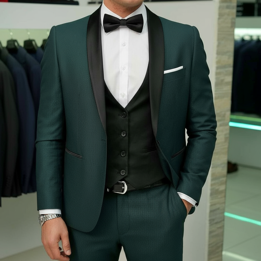 Abito Smoking cerimonia petto sciallato in raso microfantasia verde
