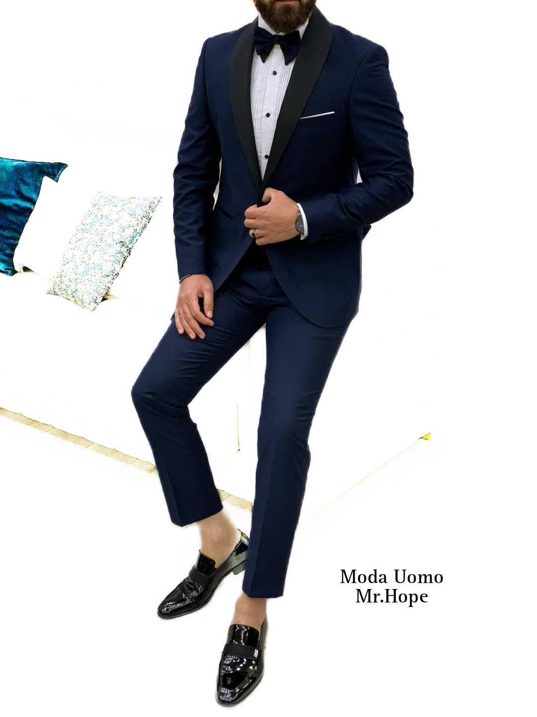 Abito Smoking cerimonia petto sciallato in raso Blu scuro