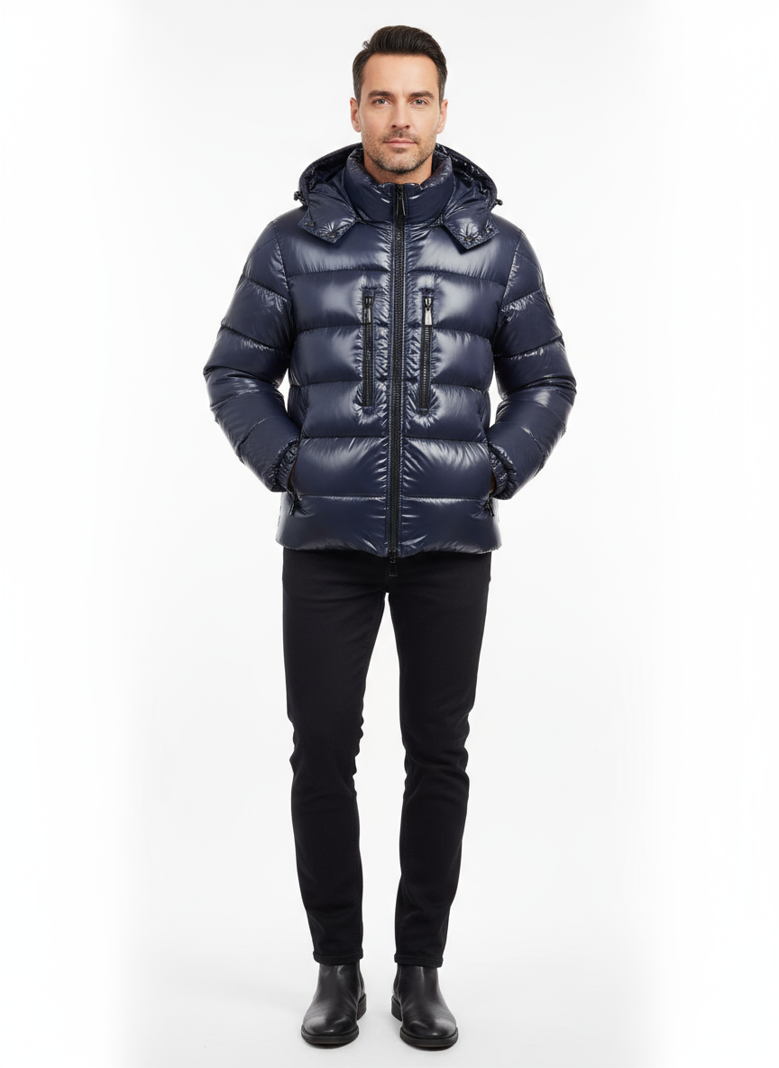 Giubbotto imbottito con zip al petto tessuto lucido impermeabile con cappuccio removibile